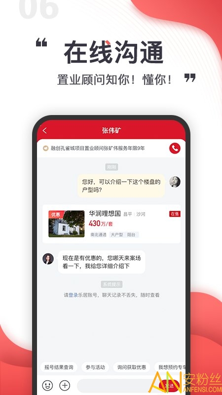 【即时通讯】可通过电话与置业顾问或楼盘联系,也有置业顾问和人工/智能客服的在线咨询帮助您,消息一触即达可免登陆沟通
