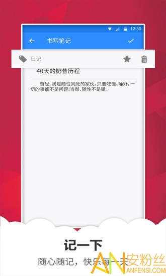 * 日记、旅游、日程、恋爱、购物、读书、记账,多样场景分类,自定义专属标签与图标,个性定制