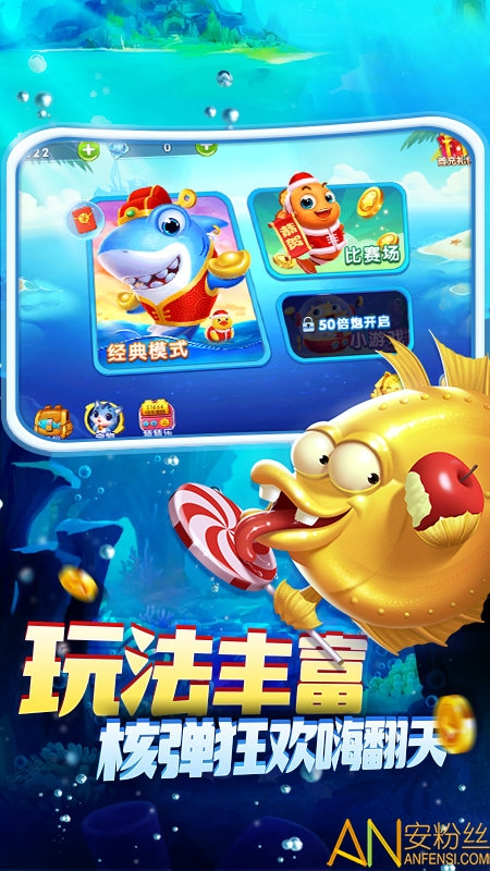 技能丰富,鱼类多样,特色boss鱼,金龙鱼、美人鱼、全屏炸弹,各种玩法多不胜数