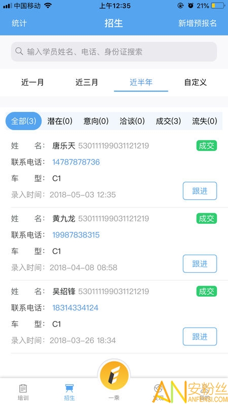 3、招生模块,一乘所有员工可以进行预报名学员的即时登记和跟踪记录,可以查看学员的学习培训情况,在不同的阶段为学员提供更好的服务,提高学员的学习体验和关怀;