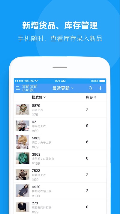 货品:上传商品时可直接入库,也可查看货品库存、销售、客户拿货情况。