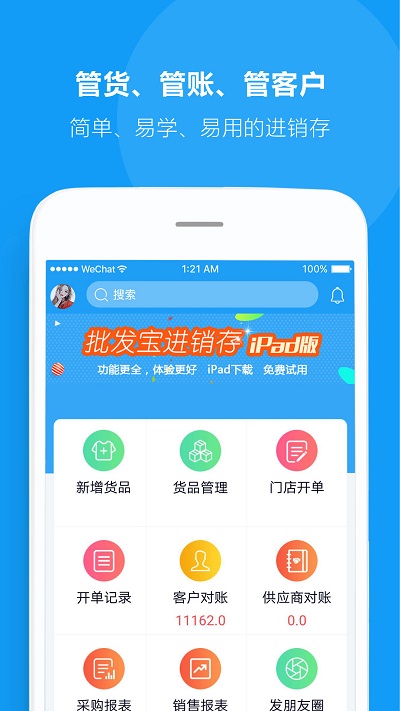 批发宝进销存app是一个可以为广大用户提供批发、销售和存货管理信息服务的软件。提供使用软件,用户可以实时上传相关信息,实现智能化分类管理,大大提高企业的办公效率,有需要的朋友就来下载使用吧。