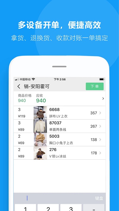 销售单:早上到货还没时间入库,可直接输入货号直接开单,网络不好也能先开单,不影响做生意。