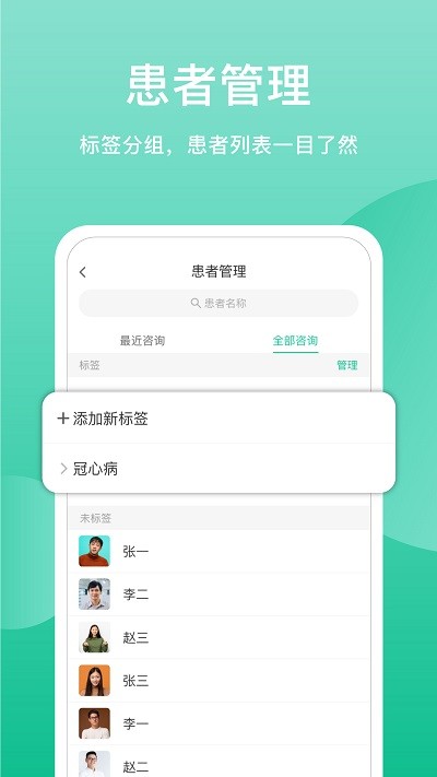 利用标签进行分组管理,管理更高效,可以随时随地为患者提供在线服务。