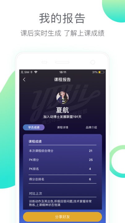 课程内容展示。支持展示热身动作课件和英语课件内容。方便学员课后复习巩固本节课所学内容,增加学员课后参与度。