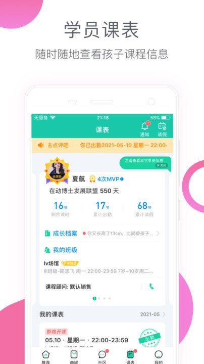 【课表】学员课程安排一目了然,课时统计清晰明了,在线掌握孩子的课程情况。