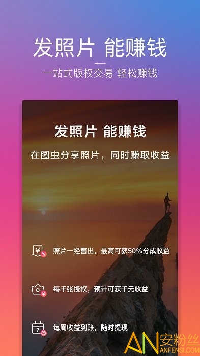 简单高效的正版图片供稿售卖流程,只需动动手指打开图虫,一站式自助售卖服务,每一张好作品都值得真金白银。