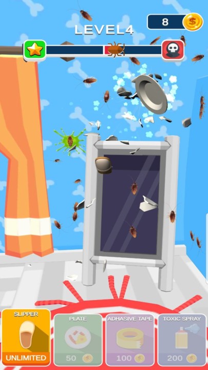 解锁新的道具,比如说手枪.炸药包或者火箭筒都是可以的,让这个可恶的蟑螂被消灭吧