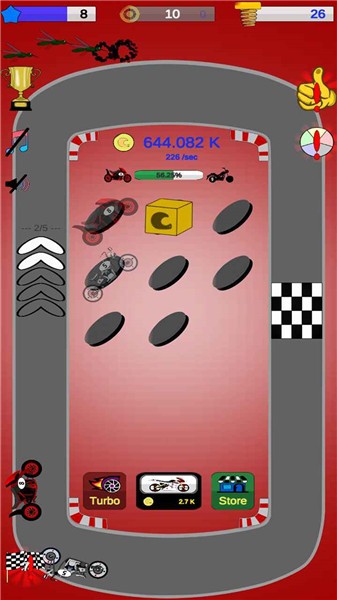 寻找、解锁、收集、启动、冲刺和合并摩托车。合并升级的玩法是游戏中始终会用到的。