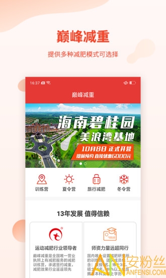 巅峰减重app是一款专注于减肥的软件,专门开设的减肥训练基地,让你减肥不在是难事,专人管理,还能外出旅游,凸显出活动的重要性,还能提供多个减肥方案,随时都能了解训练的事情,喜欢的小伙伴快来小黑安卓网下载体验吧!
