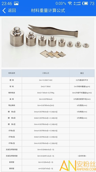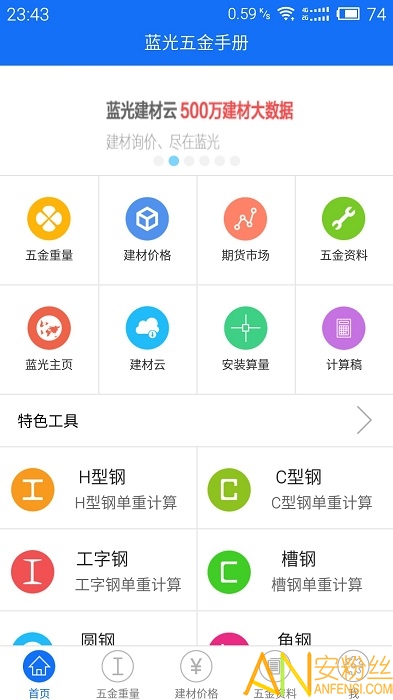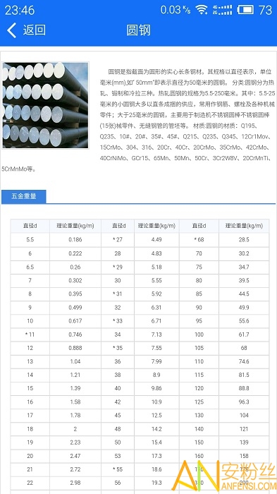 蓝光五金手册是一个五金材料的查询工具,提供建设行业常用五金材料理论重量、规格、密度、计算公式、市场价格等信息。实时、动态更新,无需升级软件就可以轻松获取更新五金资料。提供:圆钢、方钢、六角钢、八角钢、螺纹钢、圆盘条、等边角钢、不等边角钢、普通工字钢、轻型工字钢、普通槽钢、轻型槽钢、扁钢、薄钢板、中厚钢板、花纹板。100多种钢材理论重量。