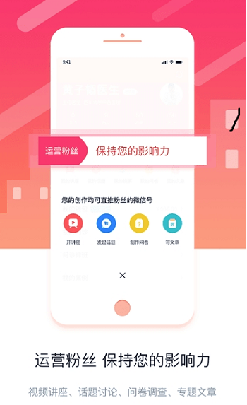 专为医护人员所设计的个人品牌营销工具,医生可进行专题直播讲座、面对面视频问诊,并一键制作名片、海报、文章、福卡等吸粉物料,快速吸粉,快速分销。
