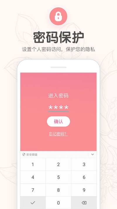 大姨妈月经期跟踪,避孕受孕更轻松,贴心可爱的经期跟踪应用程序。并且跟踪您的排卵日,受孕期,经期;无论你有规律或不规律的月经时段,女孩们都可以每天查看预测月经周期,清楚地展示日期信息以及生育和排卵日;是您专属的个人私密日记和大姨妈医生小秘书,用我们的周期日记跟踪,轻松惬意的管理你的生活!