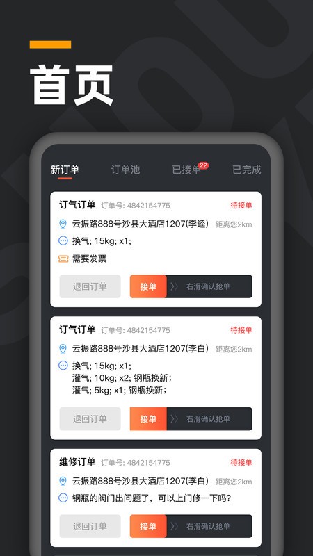 气来了平台业务员终端App,随时随地查看配送订单,信息丰富,接单没有任何的限制,谁都可以自由选择。可以记录物品的始发地、产品信息和每一次开关等内容,并同步更新系统。
