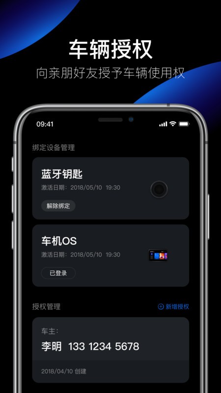 车辆授权管理向亲朋好友授予车辆使用权,被授权人无需钥匙,打开手机app即可用车