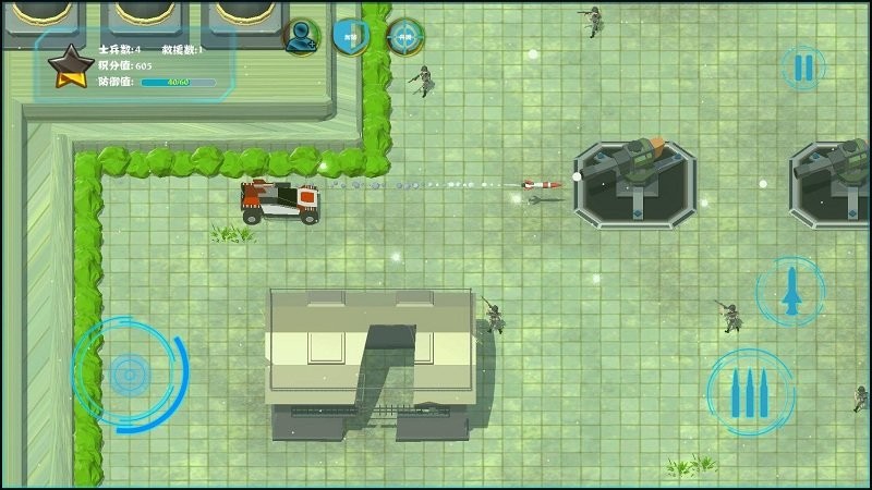 3.操作介绍:左手操作遥感,控制吉普车行走方向。右手操控机枪和导弹,与地方作战。