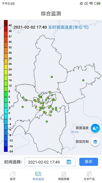 通过地图查看武汉地区实时实况数据和24小时实况历史数据,查看雷达回波图