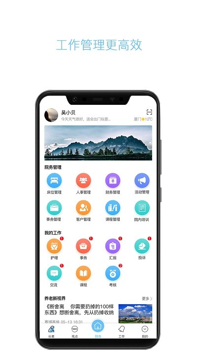 云龄app针对日常管理需要推出床位管理、人事管理、财务管理、活动管理等多种管理功能,每当有新消息的时候系统就会显示红点,红点内数字代表消息数量,这样有助于加快你的日常工作速度;只要灵活运用功能就能快速完成机构的管理;软件针对日常工作推出汇报、投诉、护理、事务、交流等功能,软件提供资讯服务,一直在收集与养老服务机构有关的资讯,阅读资讯就能了解到机构相关的动态信息。