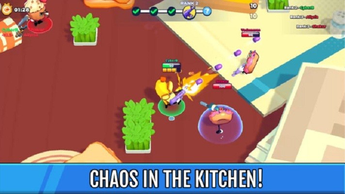 游戏有各种食物组成的王国,我们将拿起武器反抗甜甜圈的独裁统治,完成各种关卡挑战,解锁使用各种奇葩武器,在食物王国中解放更多被关押的食物,整个过程轻松有趣,同时也不乏射击游戏的刺激。