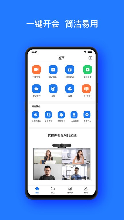 简单易用、高清流畅、安全可靠的云会议协作平台,界面清爽,操作简单.,在ipad、iphone、其他移动设备、windows.、mac、 h.323/sip上均可使用。