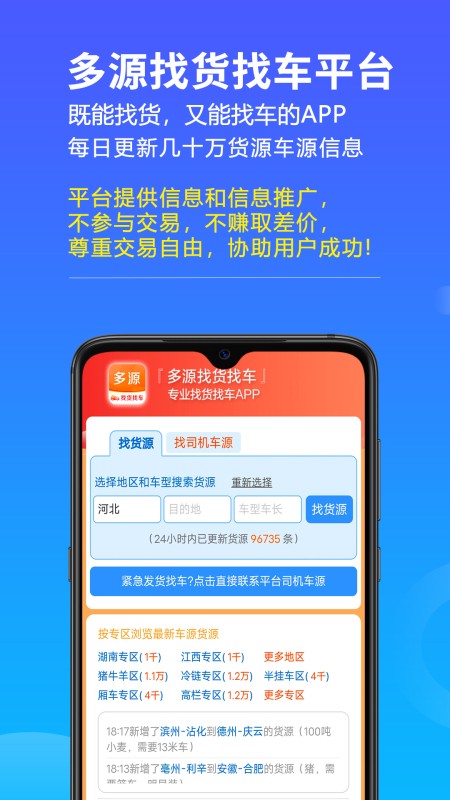 多源找货找车app上海坤佑网络科技有限公司开发的非常快捷实用的货物运输手机app,用户通过手机就可以安排到车辆来解决自己货物运输的难题,平台的运输司机师傅都是非常专业的,安全有保障,有需要的用户快来下载使用吧。