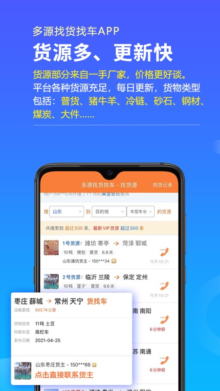 4、平台每天更新几十万货源车源信息,部分货源来自一手直接货主,早联系机会多