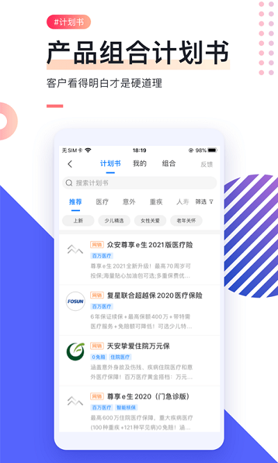 专属名片、客户续保、智能计划书、展业软文、精美海报、朋友圈访客追踪系统,提高签单效率。