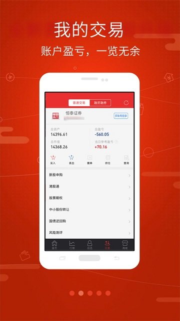 恒泰证券金玉管家手机交易平台是恒泰证券免费为证券投资客户提供的一款集全功能软件平台,包含了证券行情、证券交易、融资融券交易、账户管理、多银行功能、场外基金、证券资讯服务等功能。具有安全、稳定、快速、便捷等特点。恒泰证券金玉管家手机交易平台是您随身的证券助手,帮助您指点间把握稍纵即逝的投资机会。