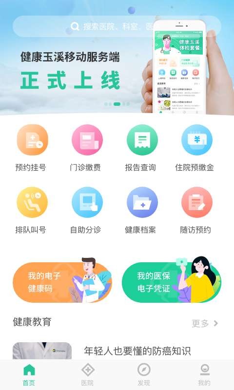 是玉溪市卫生健康委推出的一站式医疗健康服务平台,发现栏目是养生栏目,可以查看养生健康食谱。如何预防疾病,常见病处理等科学小知识。居民可通过App进行玉溪市内各级医疗机构预约挂号、门诊缴费、住院预交金缴纳及健康档案和报告查询。