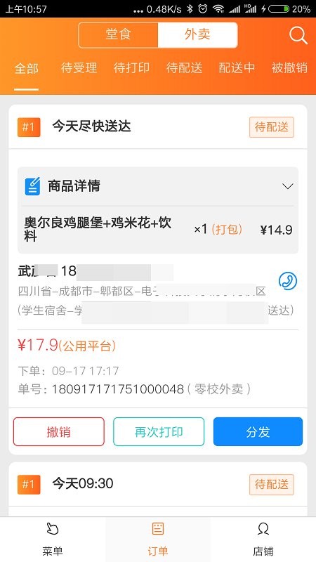 3、用户在软件中能够看到各个外卖订单信息,及时制作菜品并进行配送;