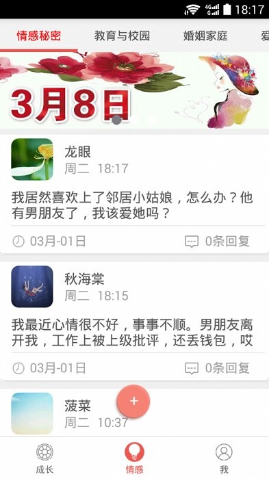 正在成长app是一款心理健康调节和资讯软,是一个心理社交平台,你可以在这里宣泄你的压力,涵盖了情感秘密、婚姻家庭、教育与校园、爱情、心理等版块,选择版块 ,诉说自己的故事,书法情感,通过声音、呼吸、他人开导等形式来调节心情。