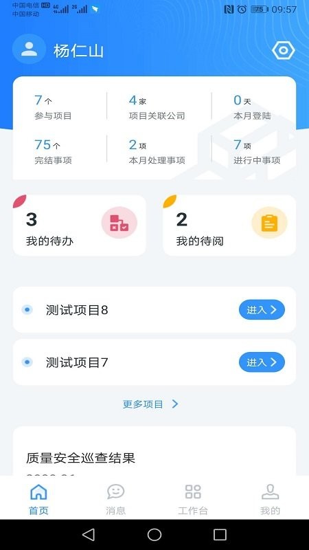 2、为用户清晰显示自己参与的项目、项目关联公司、完结事项和本月处理事项数量信息;