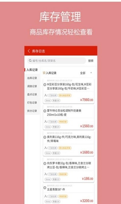 入库、出库、调拨、盘点、打包、拆分等库存日志管理,轻松查询每件商品去处,清楚库存数量,及时补货