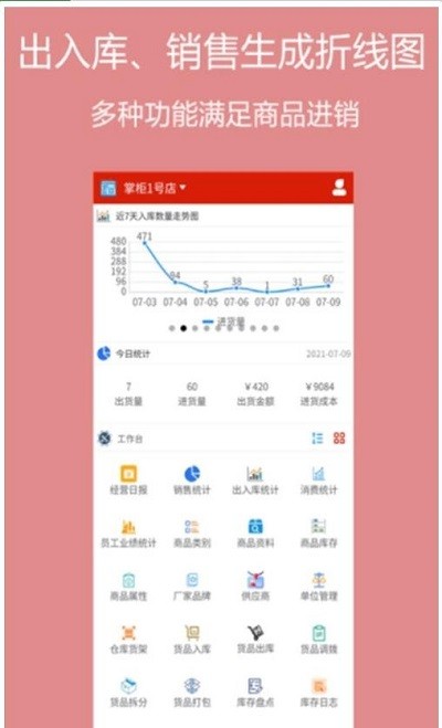 每天的出库数量走势图实时更新,库存一目了然,统计每日出货量、进货量、出货金额、进货成本,商品与成泵实时查看