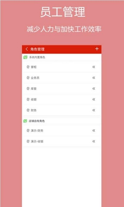 可自行添加角色,业务员、库管、收银、财务等员工管理,有效减少人力、提高工作效率