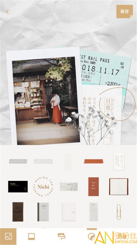 「NICHI」一词来源于日语的「日」,我们希望帮助大家用手工拼贴的形式记录「日常」。珍惜每一份细节和情绪,感知时间的奇迹。拟真素材还原手工拼贴质感!