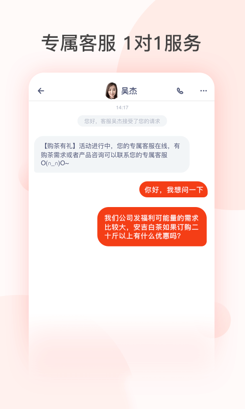 茶吉送为每位顾客配置一位专属客服,购茶疑问、饮茶技巧等所有茶相关的问题,欢迎随时咨询~