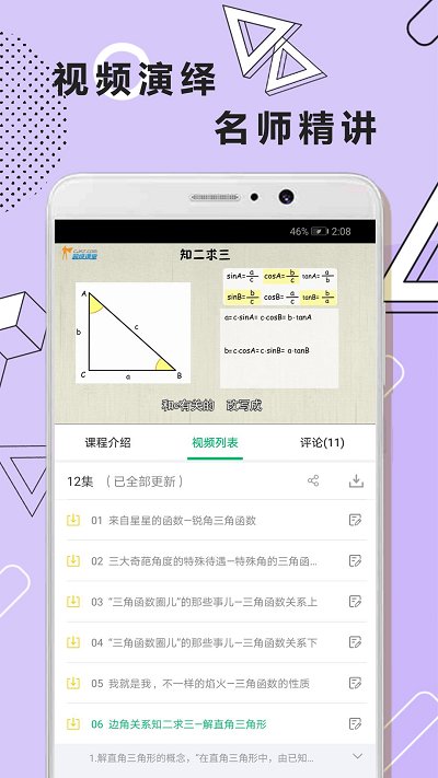 初中数学几何app是一款专业知识分享手机软件,用户可以来这里一键查看最新的数学知识,超多专业的课堂知识免费分享用户查看阅读,让你轻松掌握数学知识要点,更多名师教学内容提供用户,喜欢的朋友快来下载吧。