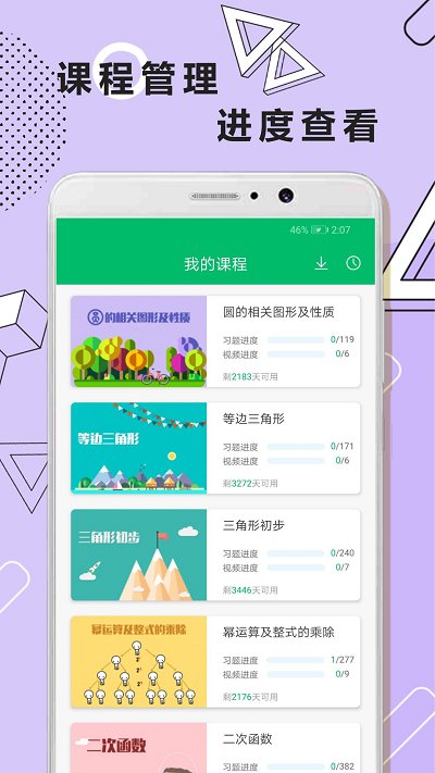 通过科学规划合理的学习时间,精心制作动画视频,记录学习成长轨迹等,让学员在十几分钟内感受学习的快乐,激发学习兴趣,让学习体验不再枯燥冗长,利用课余碎片化时间快速提高成绩,高级教师讲解,科学规划,涵盖了初一,初二,初三数学,可以帮助用户更好的学好初中数学。