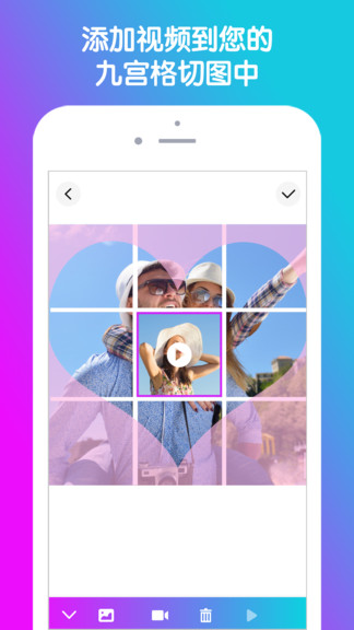 在发送朋友圈的时候可以轻松的享受到九宫格朋友圈的乐趣,让你的动态变得更有文艺范。软件还提了许多的个性操作版块,用户可以轻松的在九宫格中添加其他的内容,这样就能够帮助你快速制作出一份独一无二的视频,然后分享到朋友圈中,成为一条独特的动态。