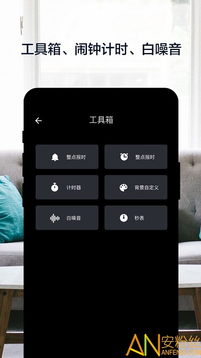 支持整点报时、闹钟、计时器、秒表、白噪音等功能;