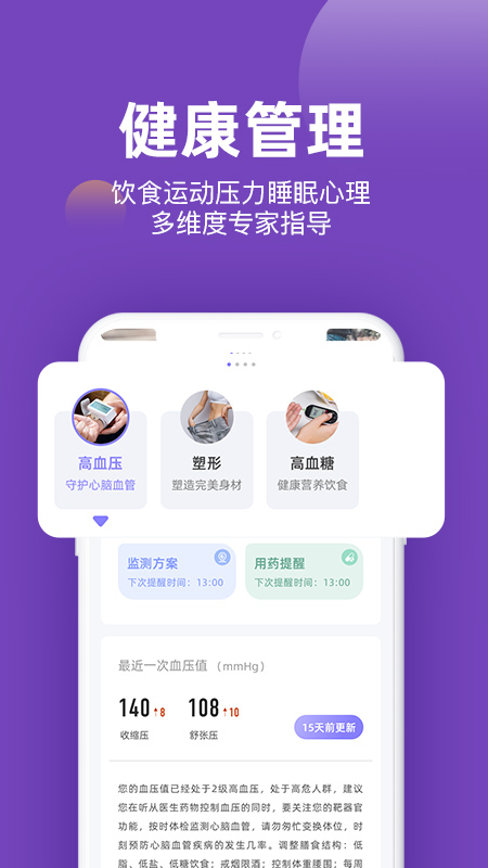 健康页大改版,新增塑形,高血压,高血糖管理功能,科学管理您的健康。