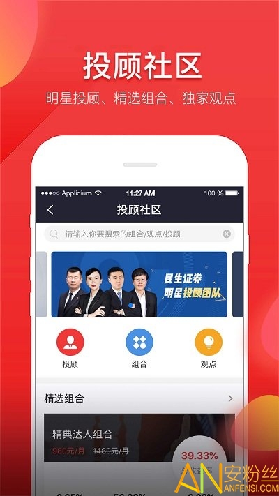 4.投顾社区,民生证券明星投顾团为您服务,精选组合助您长期跑赢大盘。