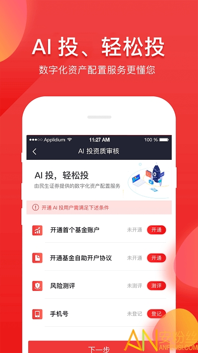 7.AI投轻松投,一键式智能基金组合,民生证券为您提供数字化资产配置服务;