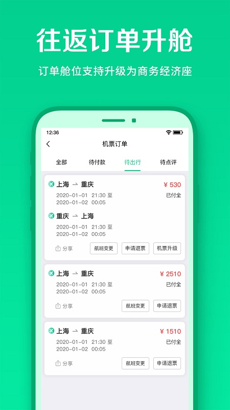 【功能优化】往返订单支持舱位升级,用户可以在机票列表或者机票订单详情中进行舱位升级,支持升级为商务经济座。