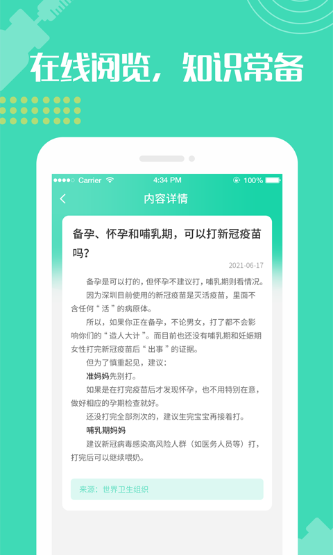 为预防接种服务对象倾心打造的移动应用服务平台,涵盖了新冠疫苗预约、核酸检测、成人接种预约、儿童疫苗预约、健康知识、疫苗百科。其中预防接种预约等专业板块的版权及数据所有权均归当地卫生管理部门所有,并受其管理和指导。