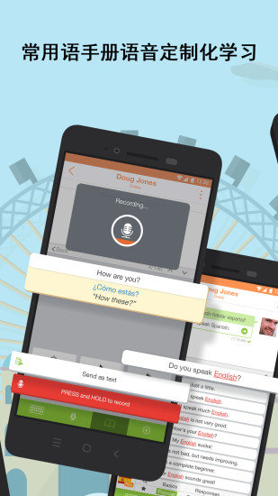 【常用语手册】聊天系统中集成了专为在线聊天定制的独家常用语手册。只需选定一个短句,聆听专业录制的指导音频,跟读音频,然后发送录音给语伴!
