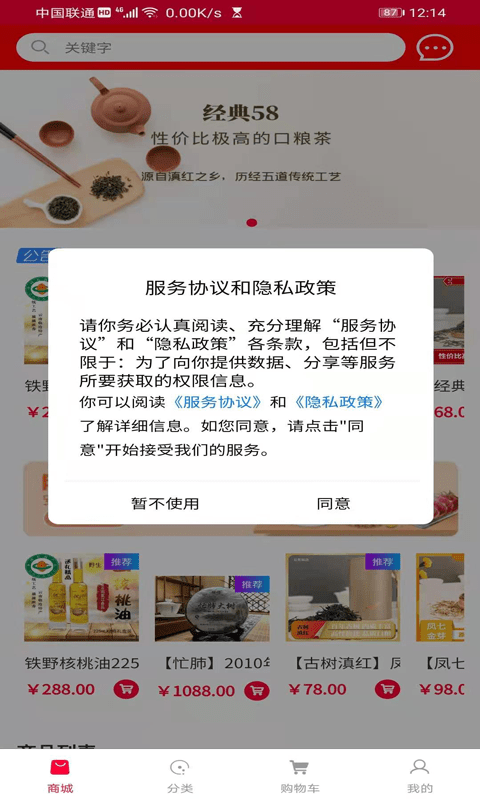 云茶商城是款专门为茶叶爱好者打造的线上茶叶采购平台哦,用户可以在这里找到超多自己的喜欢的和高品质的茶叶,品类齐全,满足用户的各种需求,哦还有专门的茶文化板块,用户可以在这里学习茶道,快来下载体验吧。