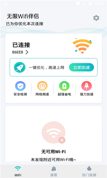 无限wifi伴侣app这是一款不错的woifi热点连接软件,帮助用户们省下手机流量,畅爽上网,免费在线追剧,看小说,软件还能自动检测清理缓存,检测网络上网环境等,非常实用,需要的用户就赶快下载吧!