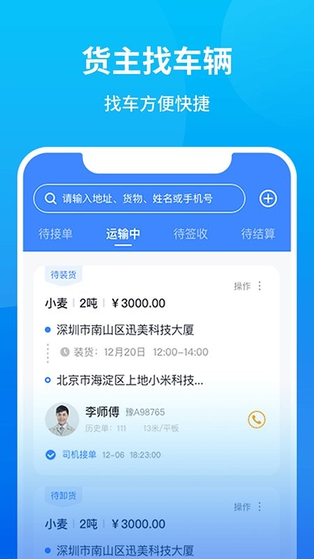 司机找货需求,快速下单,一键接单,操作简便,易用性好。